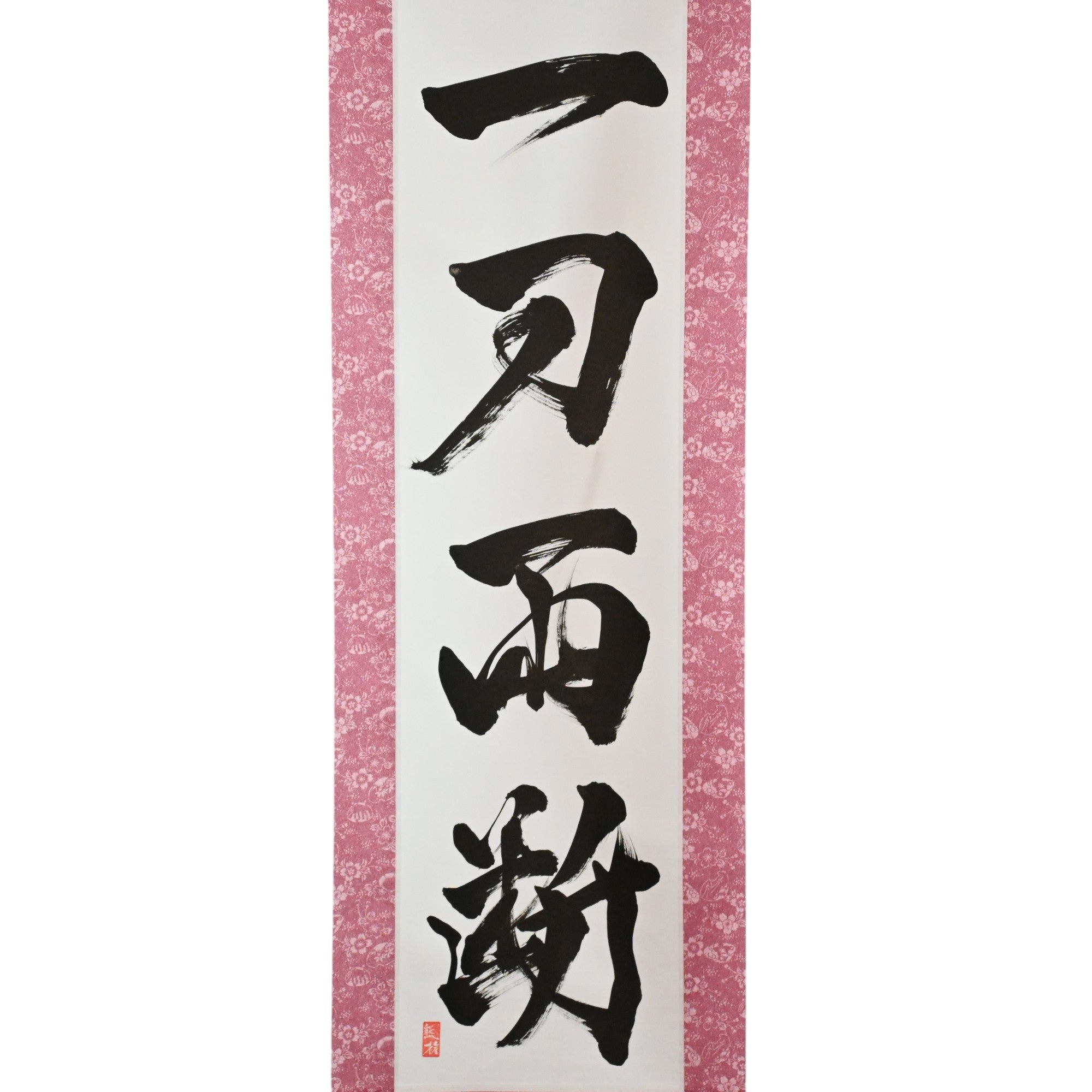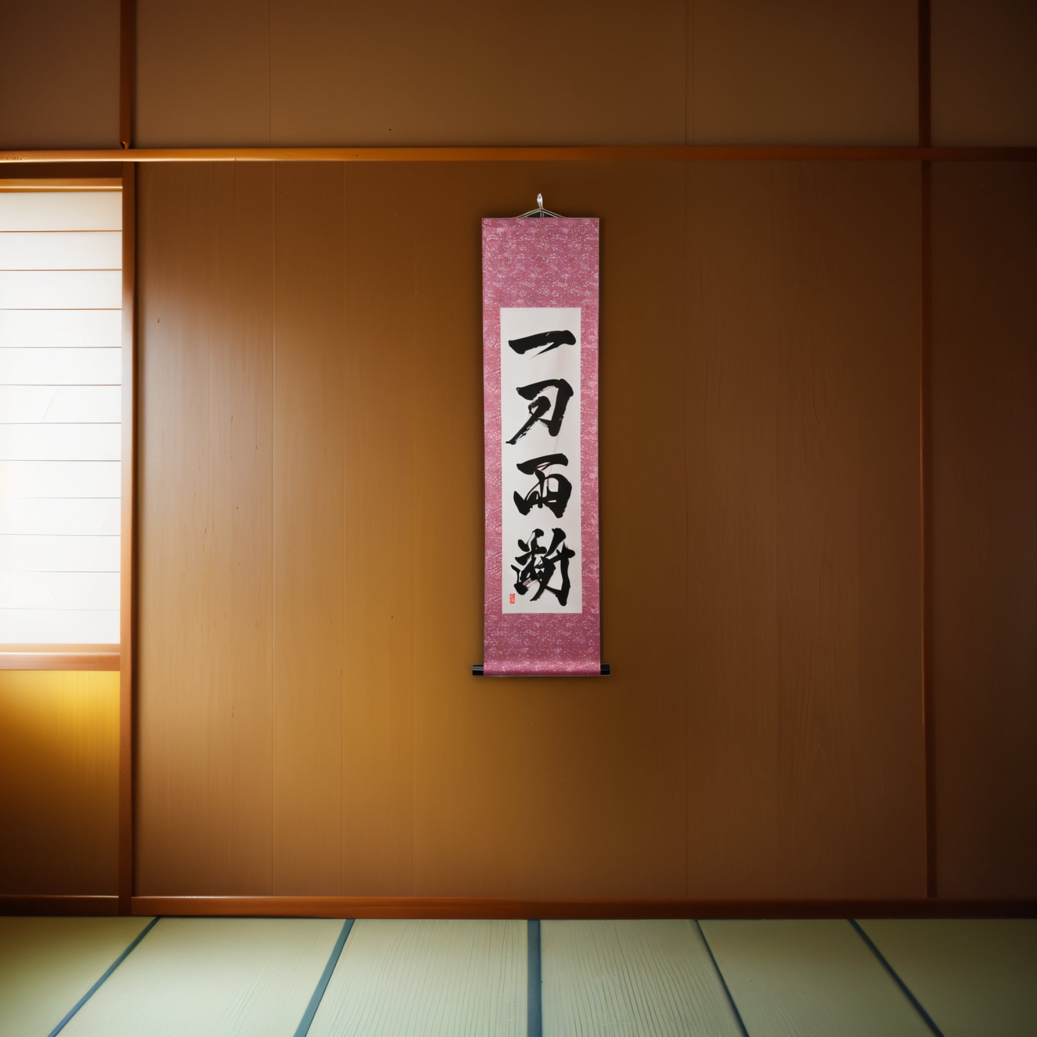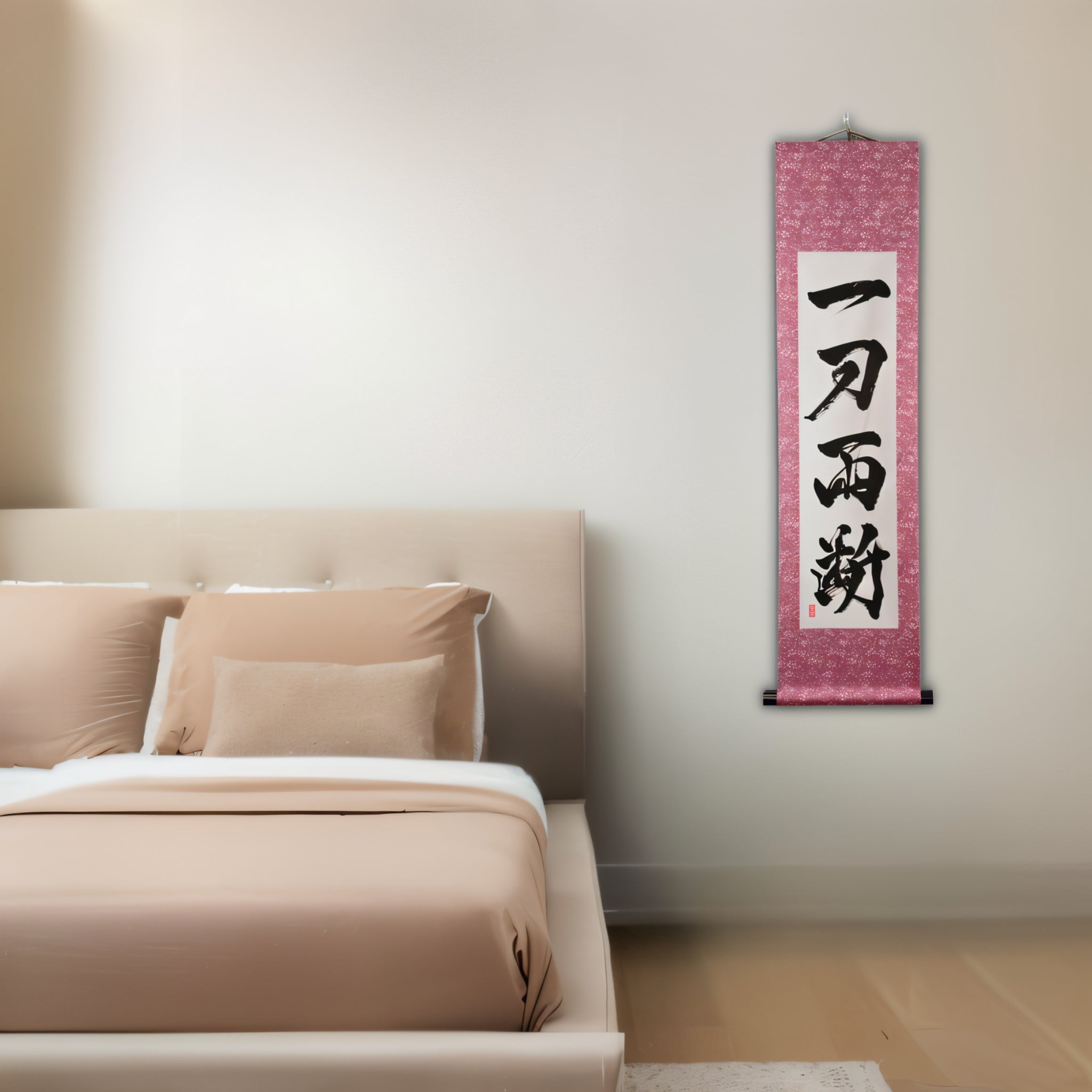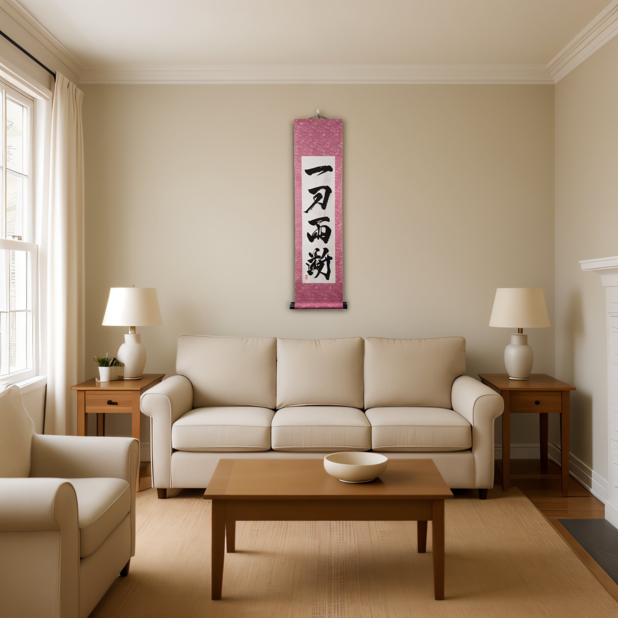 Diese japanische Kalligraphie-Rolle zeigt kühn den Ausdruck 一刀両断 (Ittō Ryōdan) — ein kraftvoller Ausdruck, der die unerschütterliche Entschlossenheit und Klarheit des Samurai-Geistes einfängt.