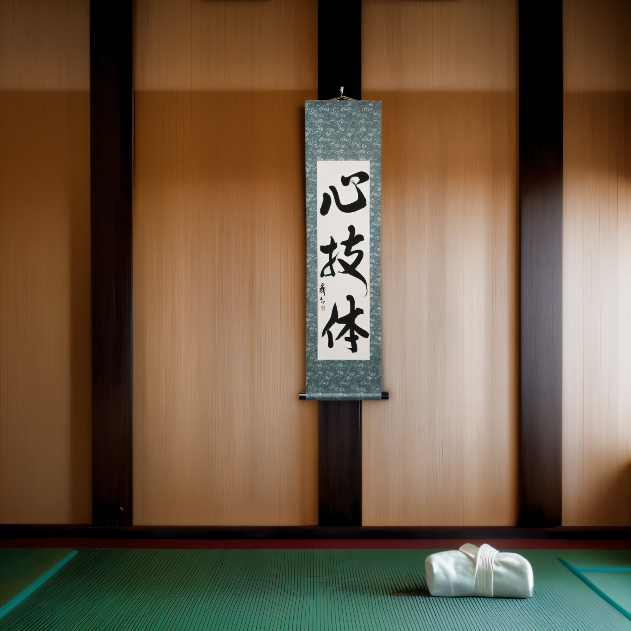 Diese japanische Kalligraphie-Rolle zeigt den verehrten Ausdruck 心技体 (Shingitai) — das grundlegende Konzept hinter allen traditionellen japanischen Kampfkünsten, einschließlich Judo, Karate, Aikido und mehr.