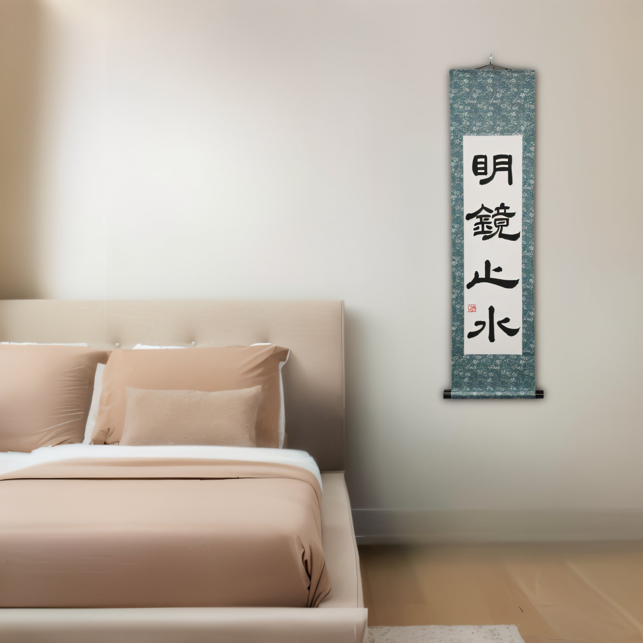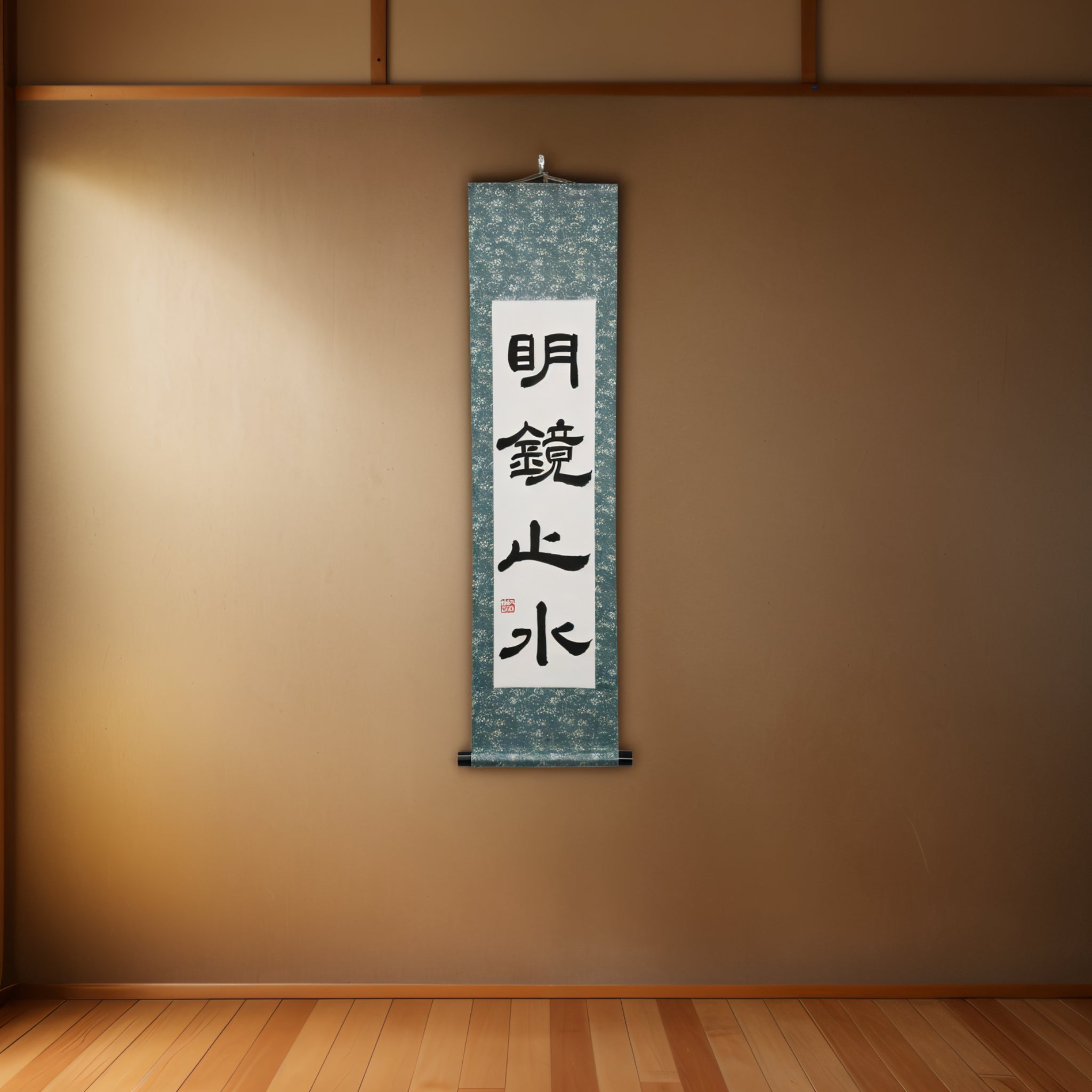Hinweis: Diese Rolle ist in der traditionellen Reisho (Klerikal-Schrift) geschrieben — einem alten kalligraphischen Stil, der für seine stille Eleganz und kontemplative Tiefe bekannt ist. Seine ausgewogenen Striche und der ruhige Rhythmus verstärken den friedvollen Charakter von „Meikyō Shisui“ und verleihen dem Stück eine zeitlose, vom Zen inspirierte Präsenz in jedem Interieur.