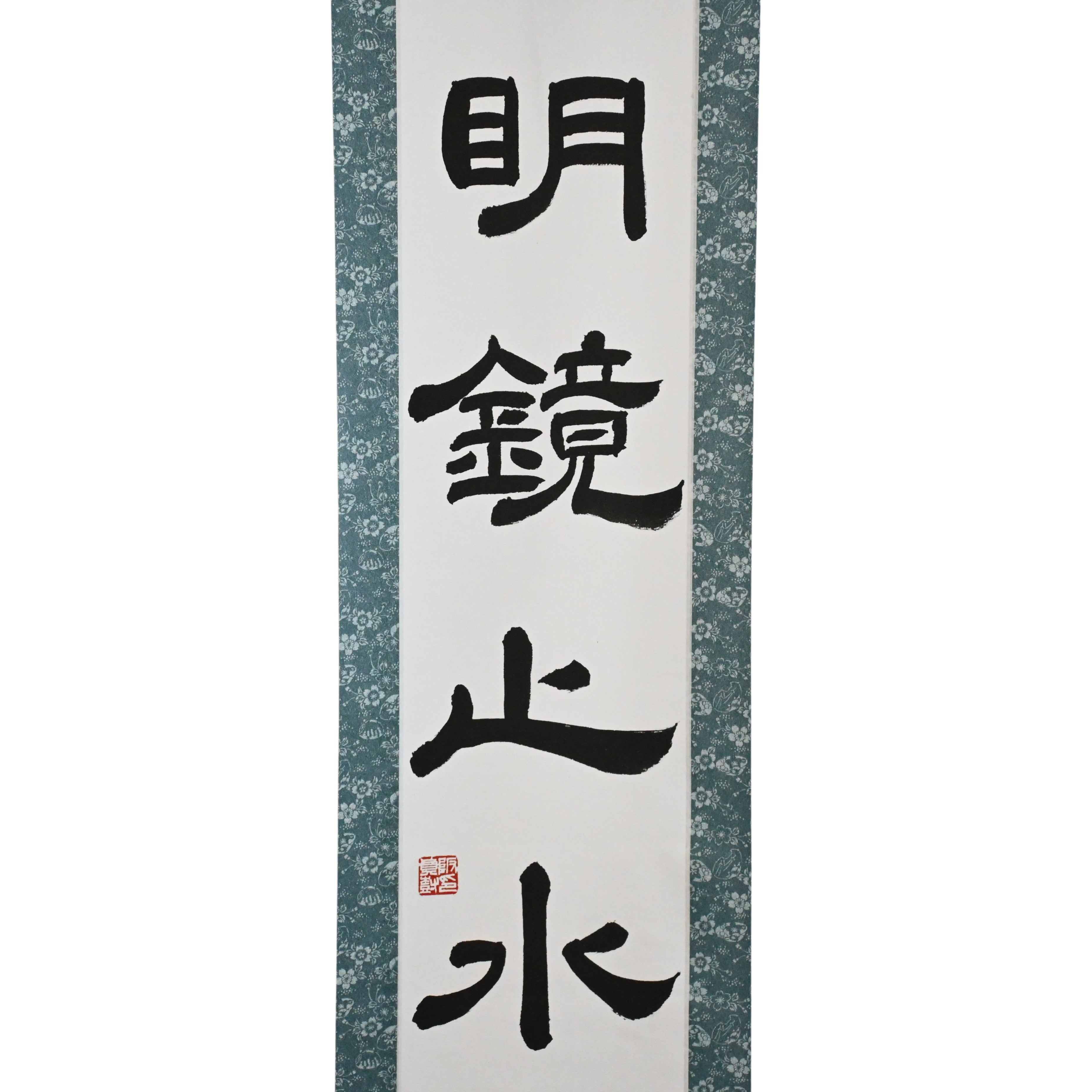 Diese japanische Kalligraphie-Rolle zeigt den ruhigen Ausdruck 明鏡止水 (Meikyō Shisui) — einen Geisteszustand, der mit einem makellosen Spiegel und einem vollkommen stillen Gewässer verglichen wird. Er steht für Klarheit, innere Ruhe und die stille Kraft, die entsteht, wenn das Herz frei von Lärm und Ablenkung ist.
