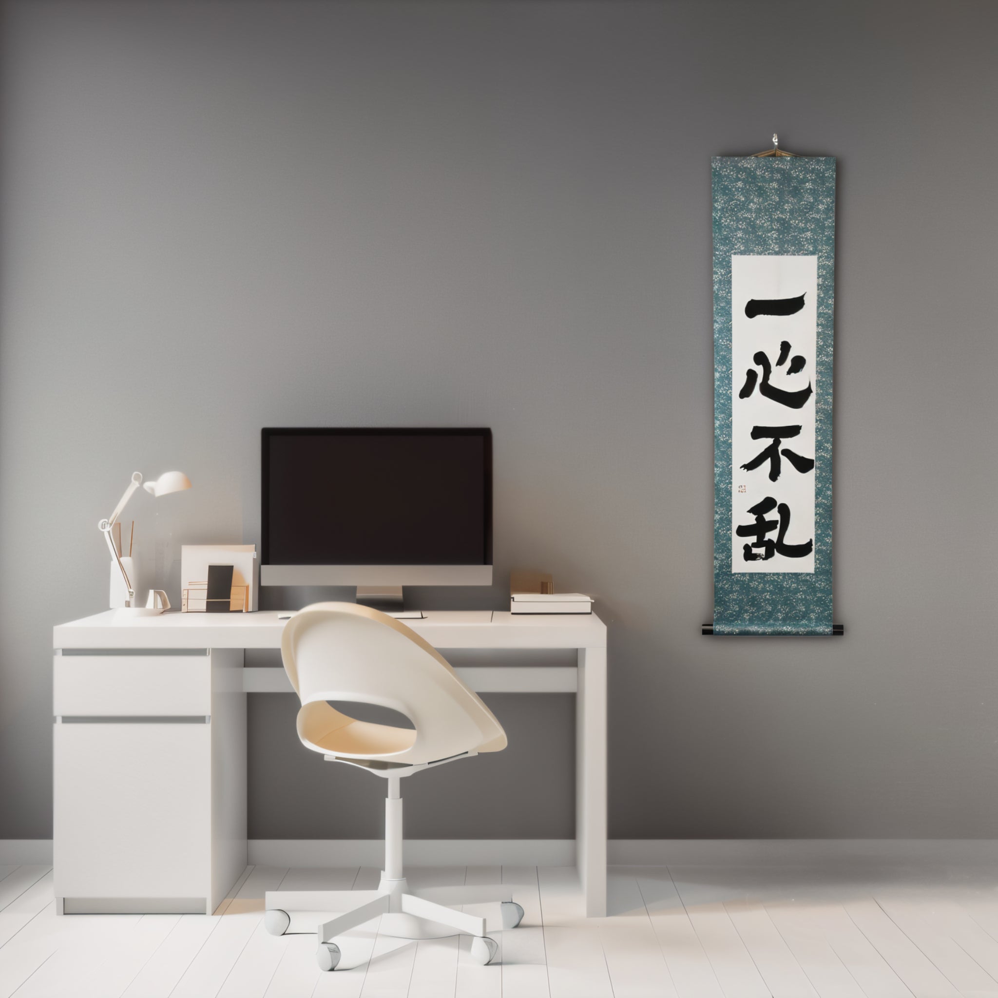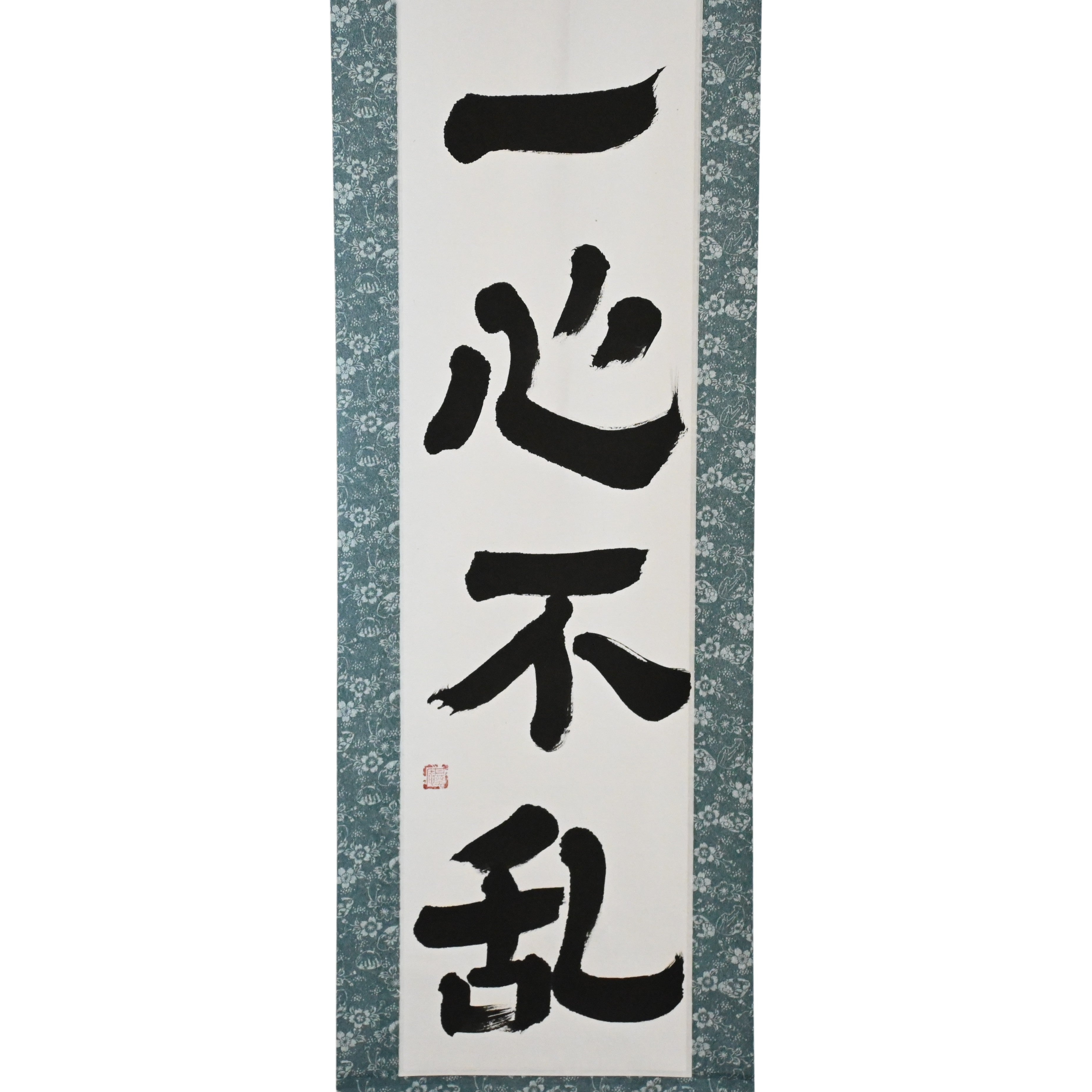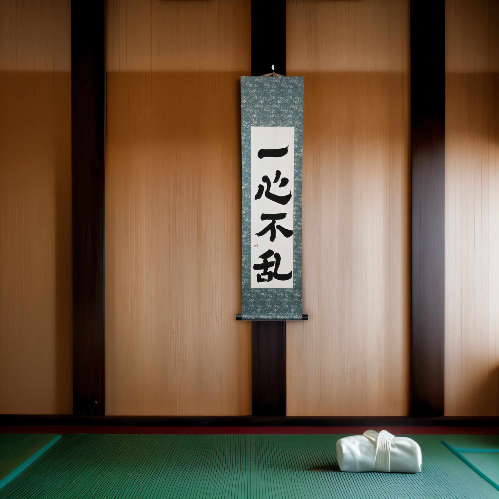 Diese japanische Kalligraphie-Rolle zeigt den kraftvollen Ausdruck 一心不乱 (Isshin Furan), was „ungeteilte Konzentration“ oder „mit einmütiger Hingabe“ bedeutet. Sie fängt die wesentliche Geisteshaltung der Kampfkünste ein — die Fähigkeit, Ablenkungen auszuschalten und sich ganz dem Moment hinzugeben.