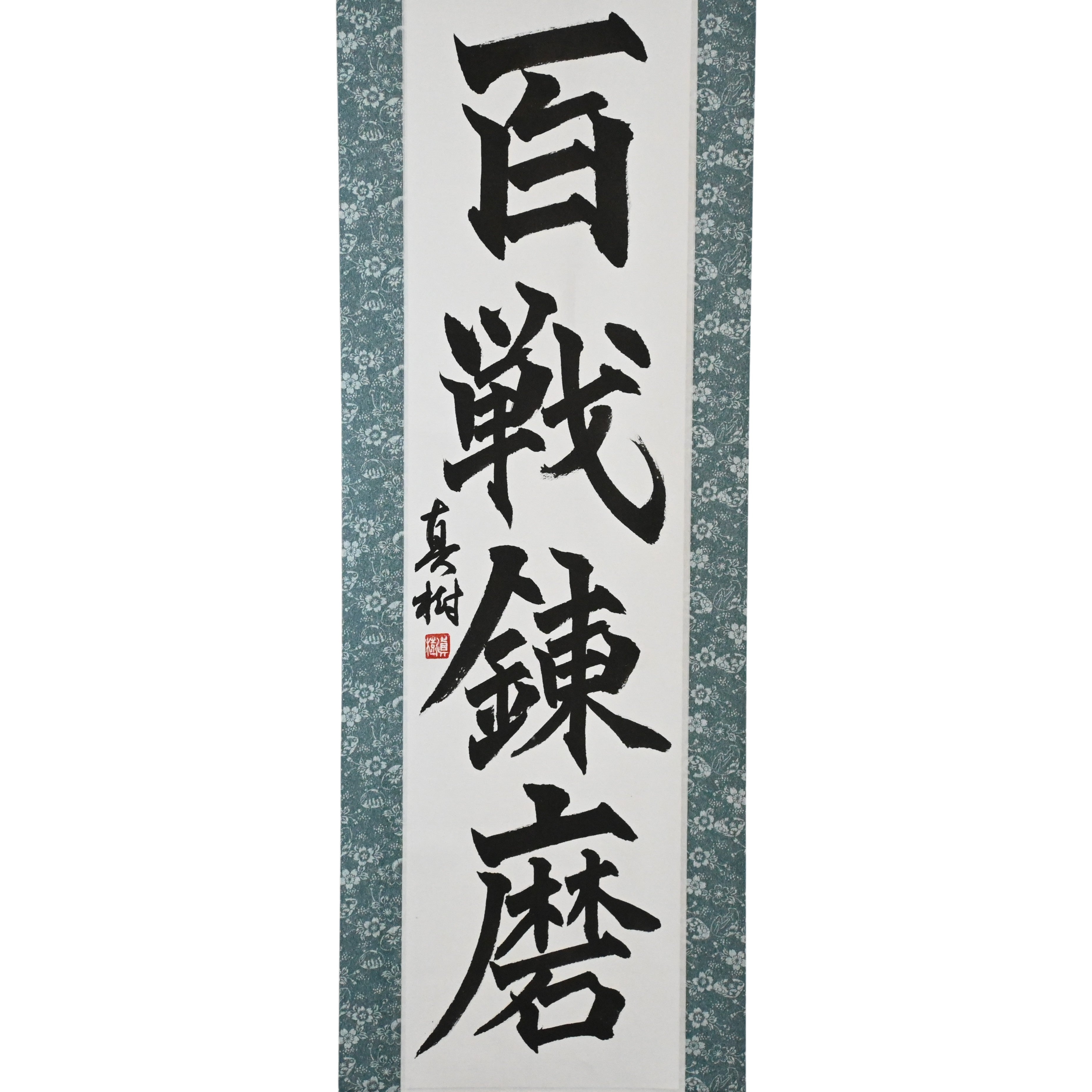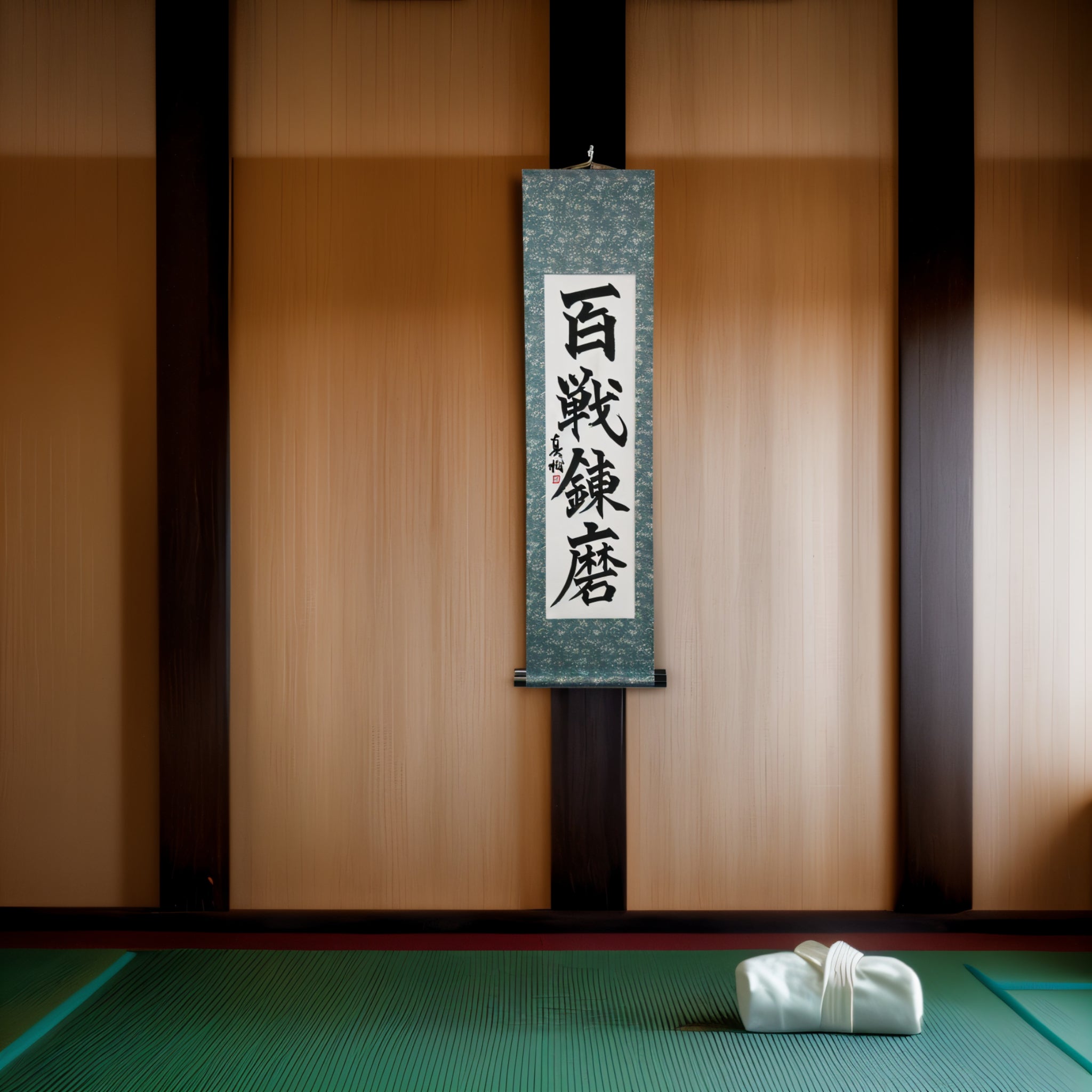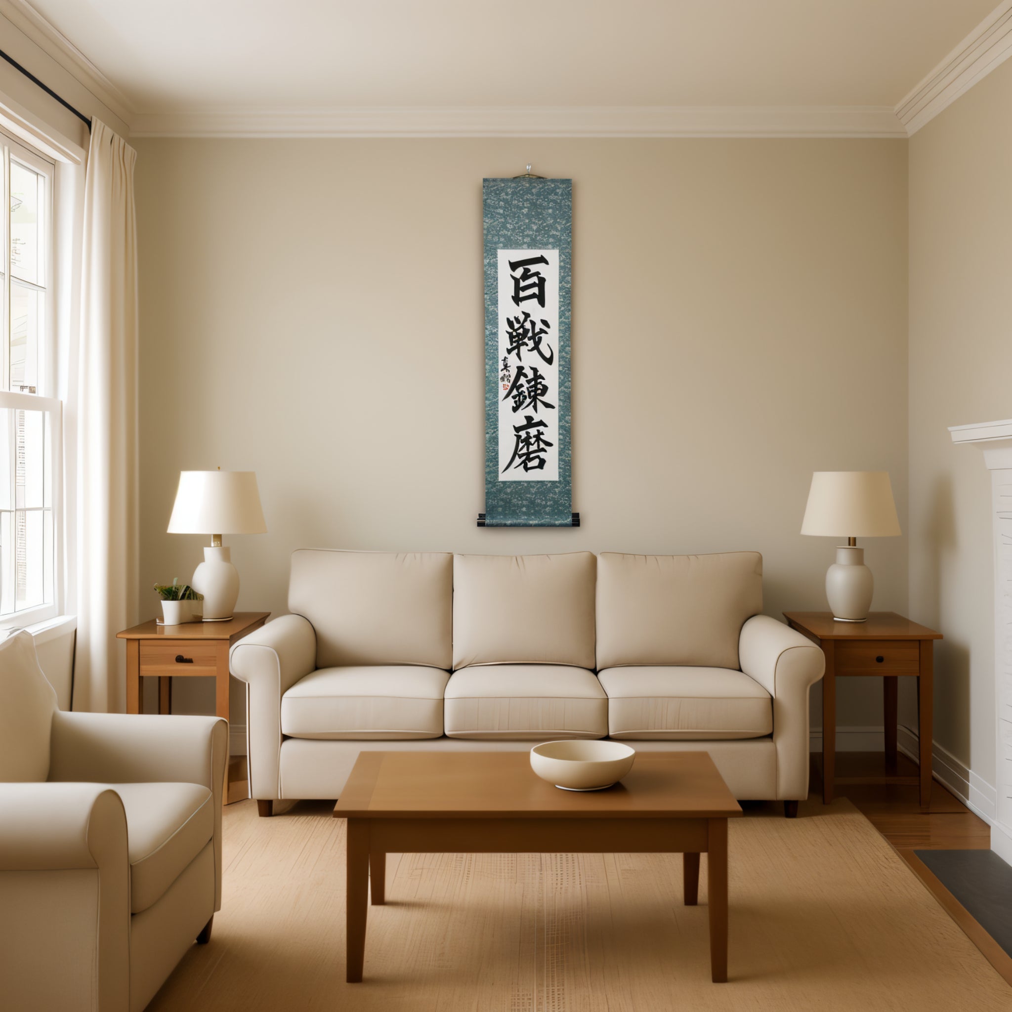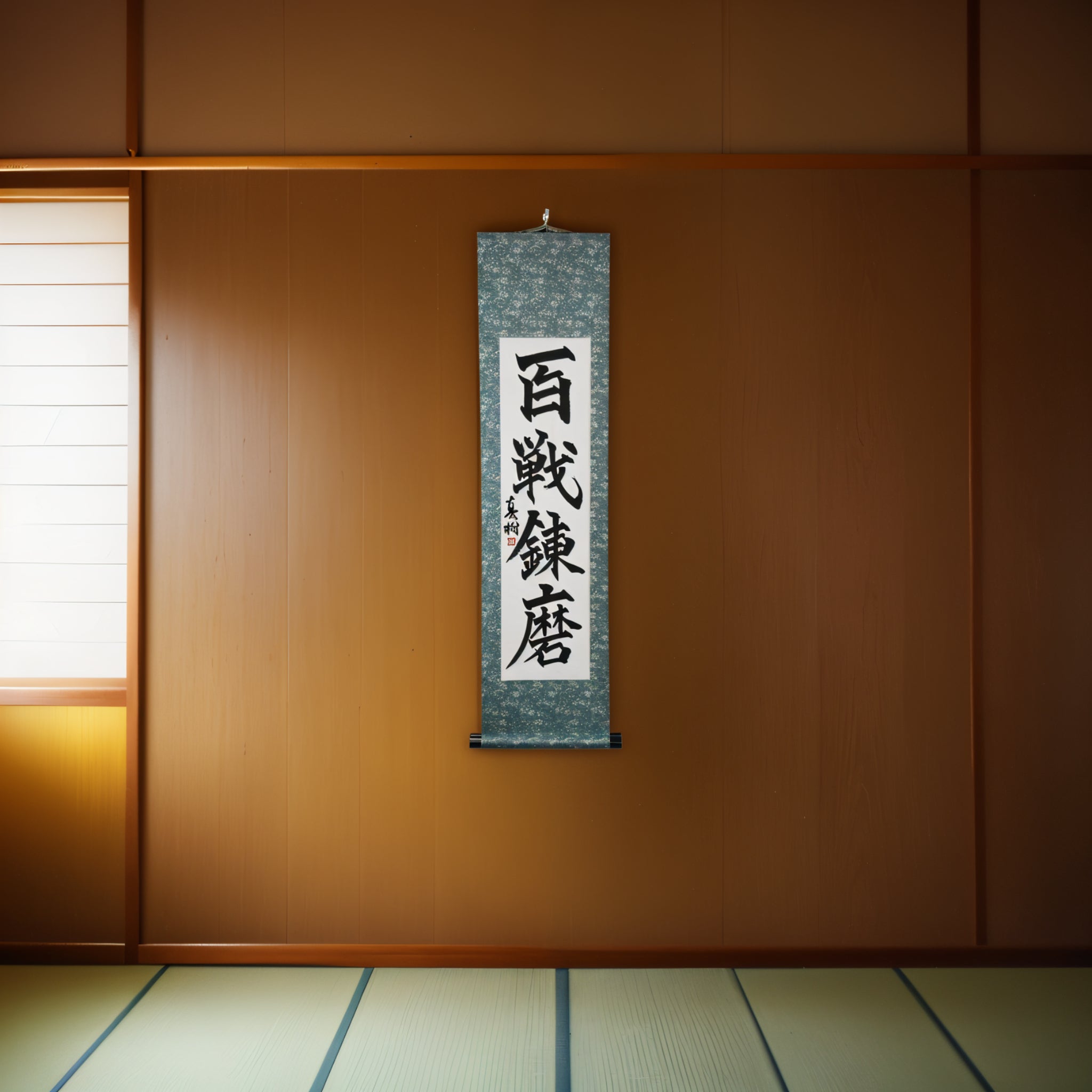 Honorez un proverbe japonais intemporel avec ce rouleau de calligraphie dynamique présentant 百戦錬磨 (Hyakusen Renma) — une expression puissante qui incarne l'esprit samouraï de force, de résilience et de maîtrise acquise à travers d'innombrables défis.